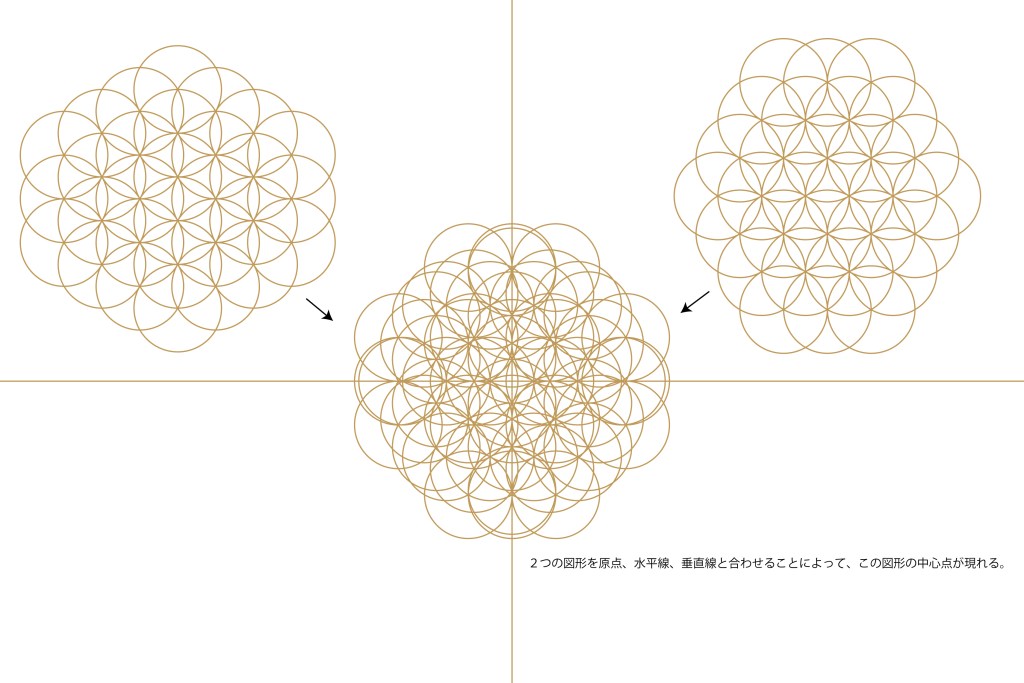 また、この図形の中には、形としては何も現れていないが左右どちらの図形にもある中心点を合わせ、その中心点を水平線、垂直線の交点に重なるように描いています。すると、これまで見えなかった中心点が現れます。