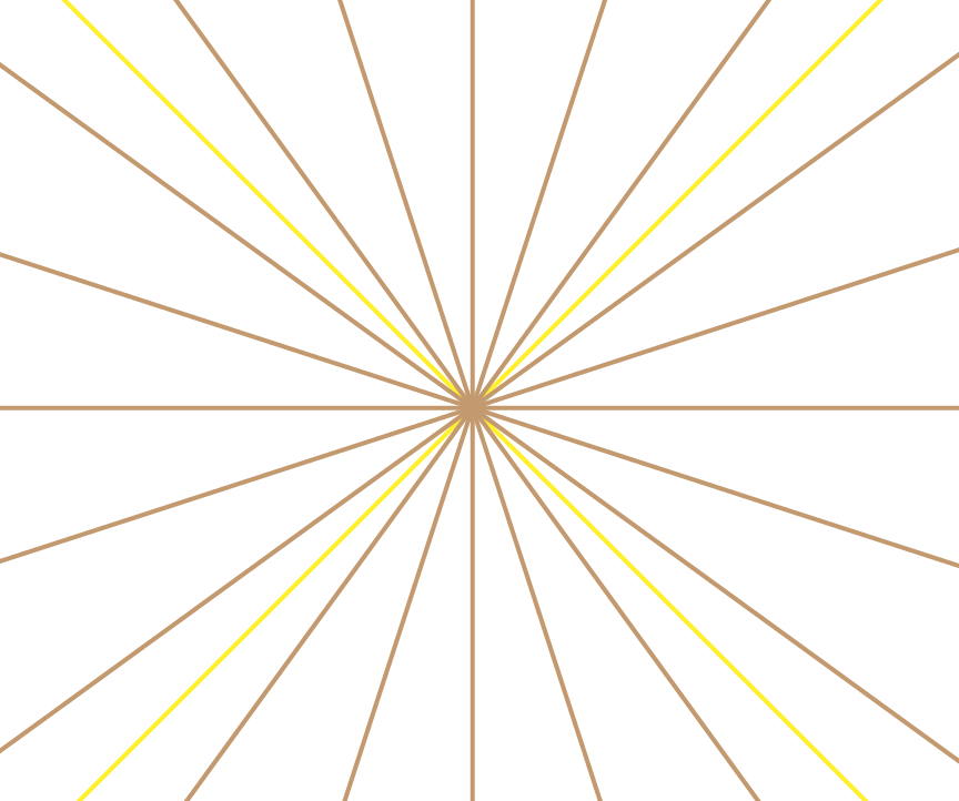 水平線、垂直線、そして、45度の対角線、水平線、垂直線からの72度で水平線、垂直線と同じ直線が360度で展開する状態。具体的には、対角線は2本あり、水平垂直合わせて72度の角度で展開する10本の直線。これがまさしく『九十』である。